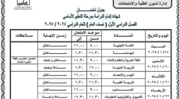 • جدول امتحانات الصف الثالث الاعدادي ٢٠٢٥ الترم الأول جميع المحافظات